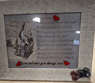 Have a picture and you want to create something beautiful, with an added poem or memory attached, we can create stunning images in picture frames with name, poem and memory. The lasered image will last a lifetime if treated properly.