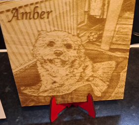 "Fantasic and so realistic picture of my dog Bruce, he even looks at it with his head tilted. More tahn happy with the price and the result, and it came varnished with little bracket for free standing.."