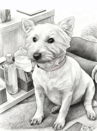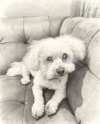 Lasered sketch pencil image done of white dog on grey MDF